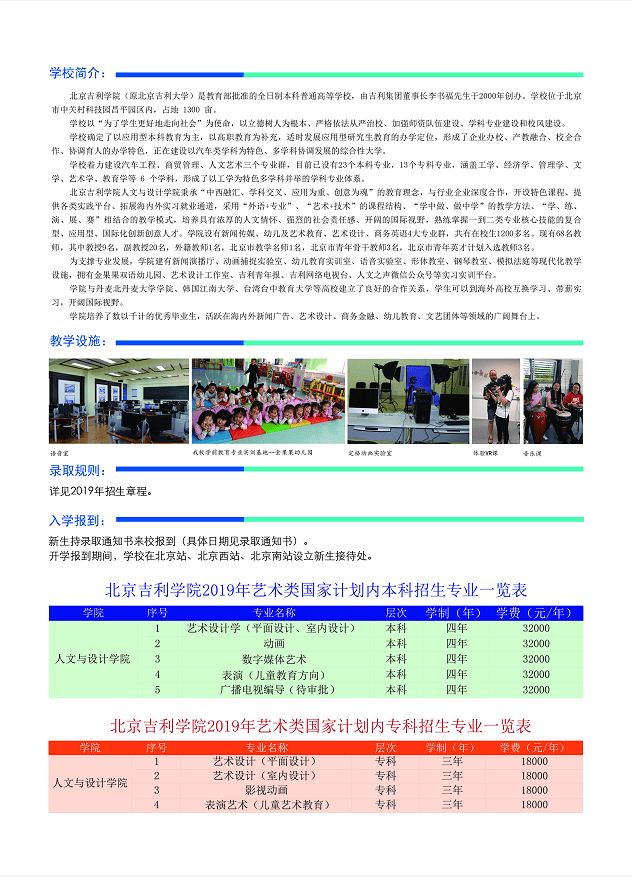 北京吉利学院2019艺术类专业招生简章